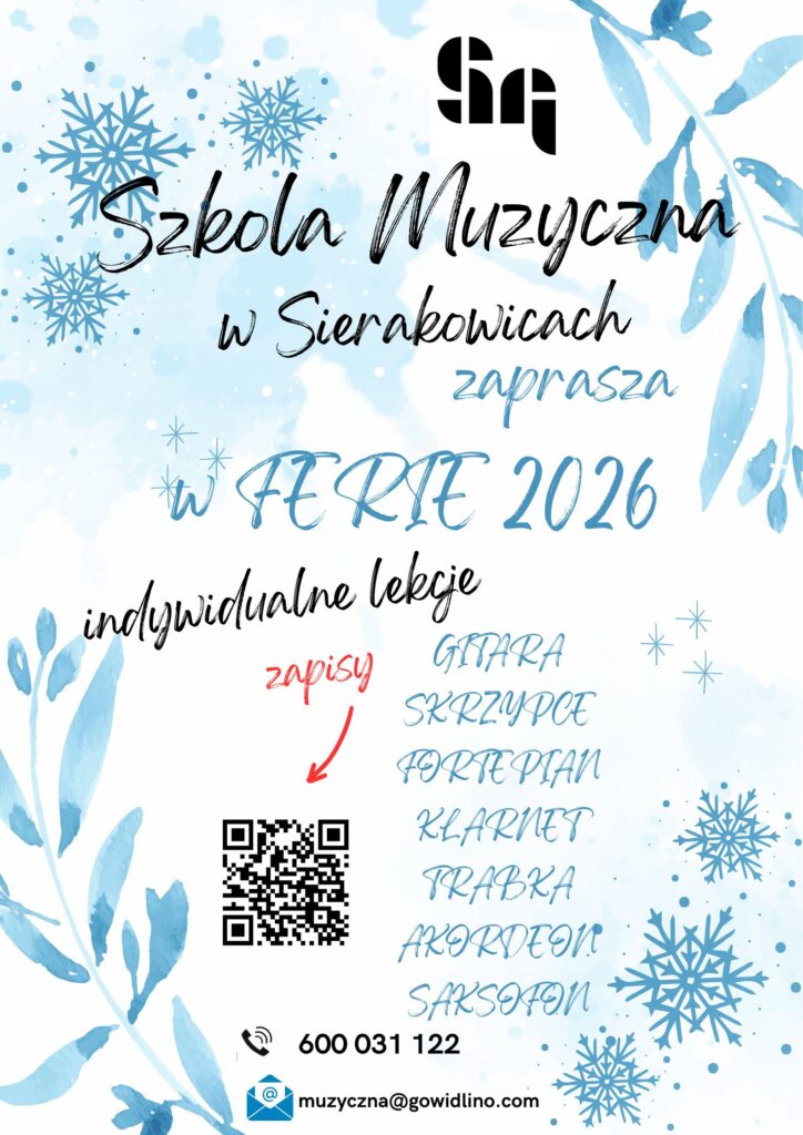 Wzorem roku ubiegłego, ogłaszamy FERIE z naszą Szkołą Muzyczną. Oferujemy zajęcia indywidualne prowadzone przez nauczycieli klas: